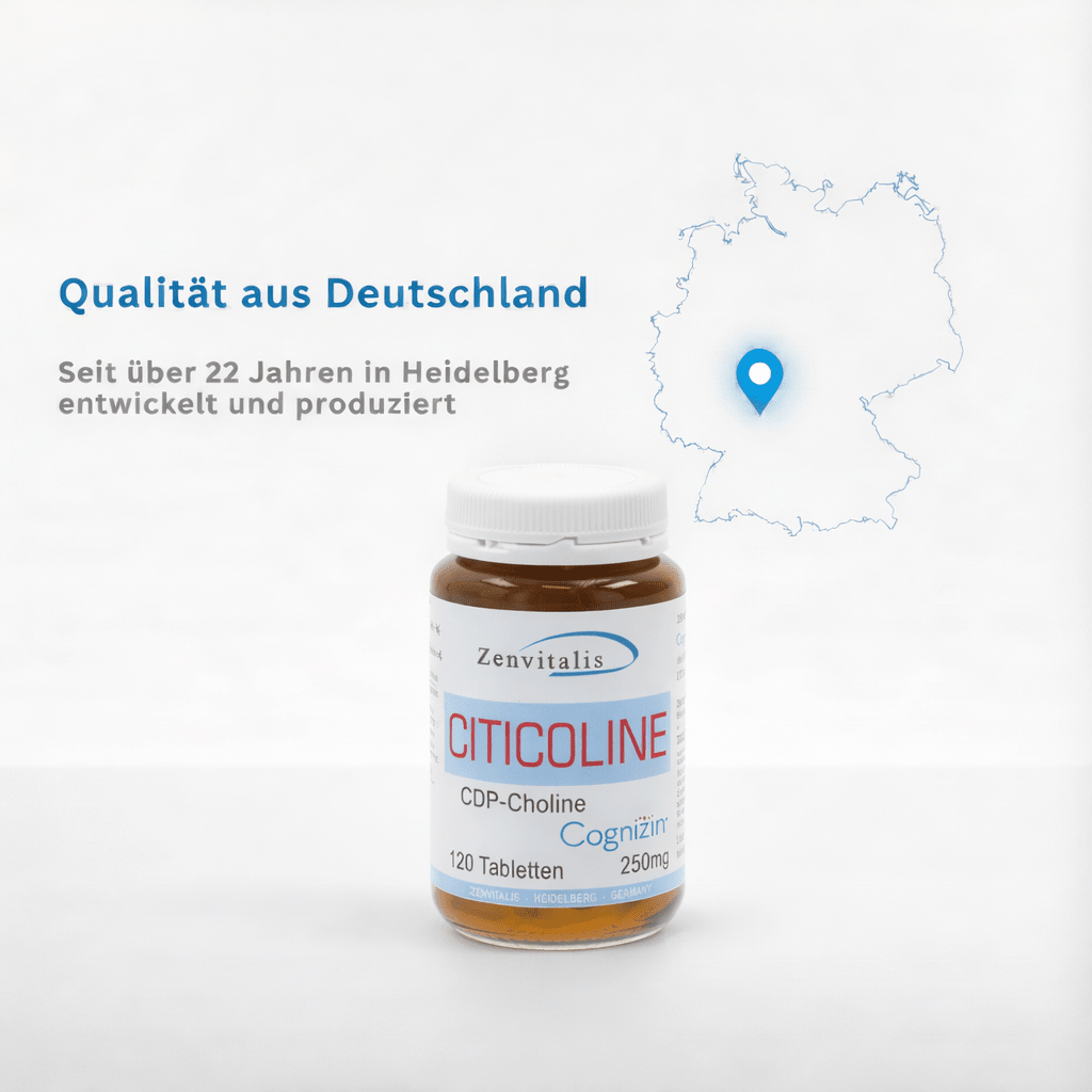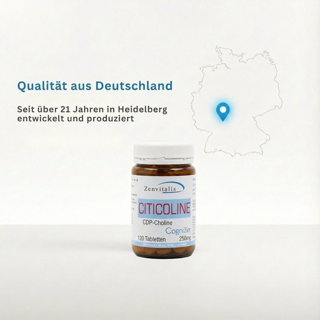 Unsere Citicoline Tabletten enthalten 250 mg reines COGNIZIN® Citicoline pro Tablette – hergestellt vom japanischen Qualitätshersteller Kyowa Hakko. Citicoline (CDP-Cholin) ist ein Cholin-Derivat.