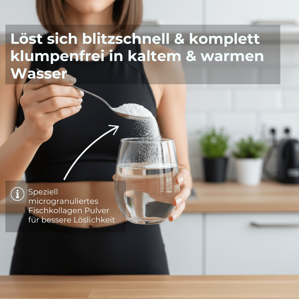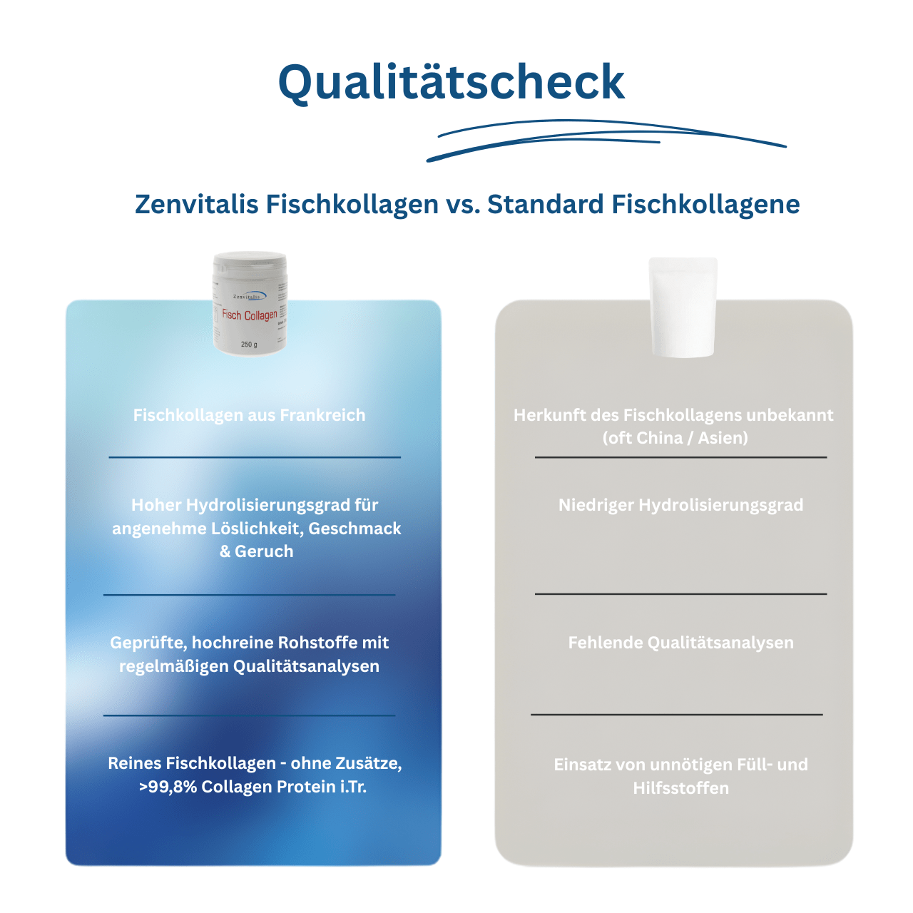 Das Zenvitalis Fisch Collagen ist ein enzymatisch gespaltenes Collagen Peptid mit niedrigem Molekulargewicht von 2 kDa. Die geringe Kettenlänge und niedrige Viskosität begünstigt eine gute Aufnahme der Collagen Peptide im Körper. Das microgranulierte Pulver ist rasch löslich in kalten und heißen Getränken ohne zu verklumpen.